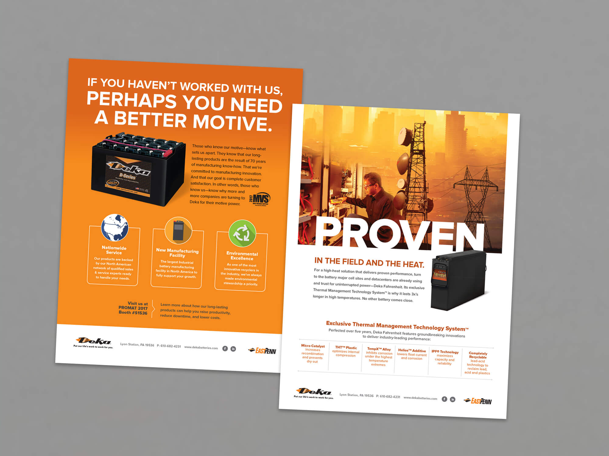 To help East Penn’s Reserve Power Division relaunch their Fahrenheit line of batteries, we conceptualized, wrote and designed trade ads targeted to two specific audiences that let the product's amazing features and attributes speak for themselves. Additionally, we developed a trade ad for their Motive Power Division that completely refreshed and reinvigorated the look and feel of their print initiative, helping them stand out and drive traffic to their booth at the material handling and logistics industry’s premier global trade show.
